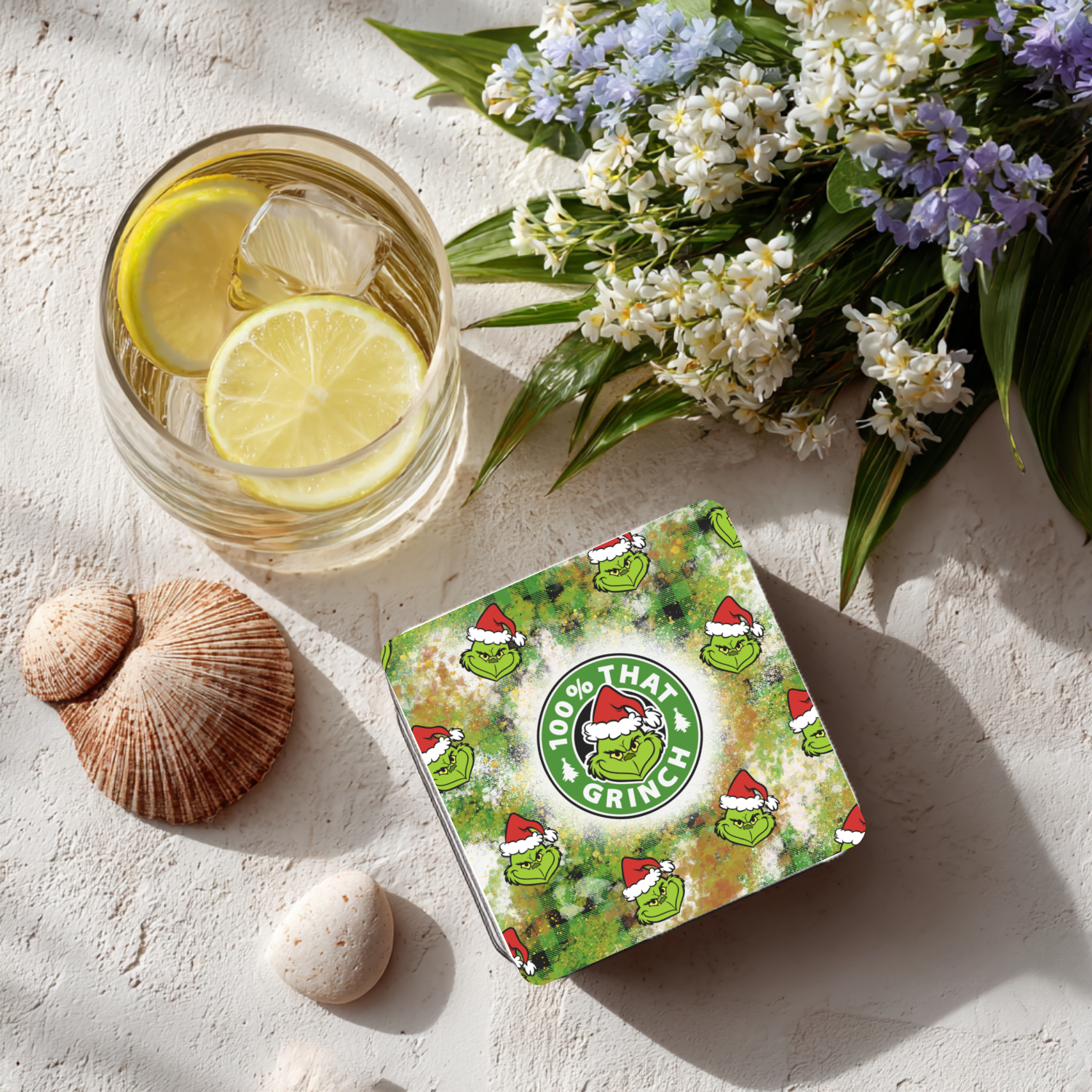 Not everybody is Mrs. Merry & Bright—and that’s okay. This “100% That Grinch” Christmas coaster is made for the fun-loving, side-eye-giving holiday crew who still shows up for cocoa, cookies, and good times.
