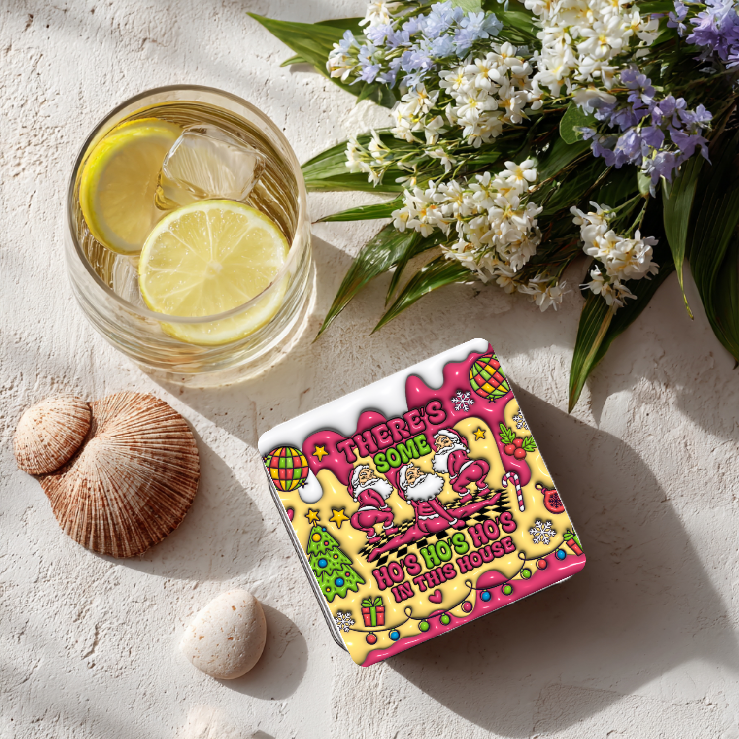 Bold text reads “There’s Some Ho’s Ho’s Ho’s in This House” for a playful, grown-up twist on holiday décor. It’s the perfect coaster for adult game nights, ugly sweater parties, and that friend who loves a little spice with their Christmas cheer.