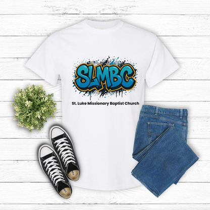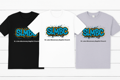 Featuring the vibrant “SLMBC” graffiti-style logo, this shirt celebrates St. Luke Missionary Baptist Church’s spirit of outreach and unity. The dynamic design, splashed with shades of blue, gold, and black, makes a powerful statement of faith that’s both modern and expressive.